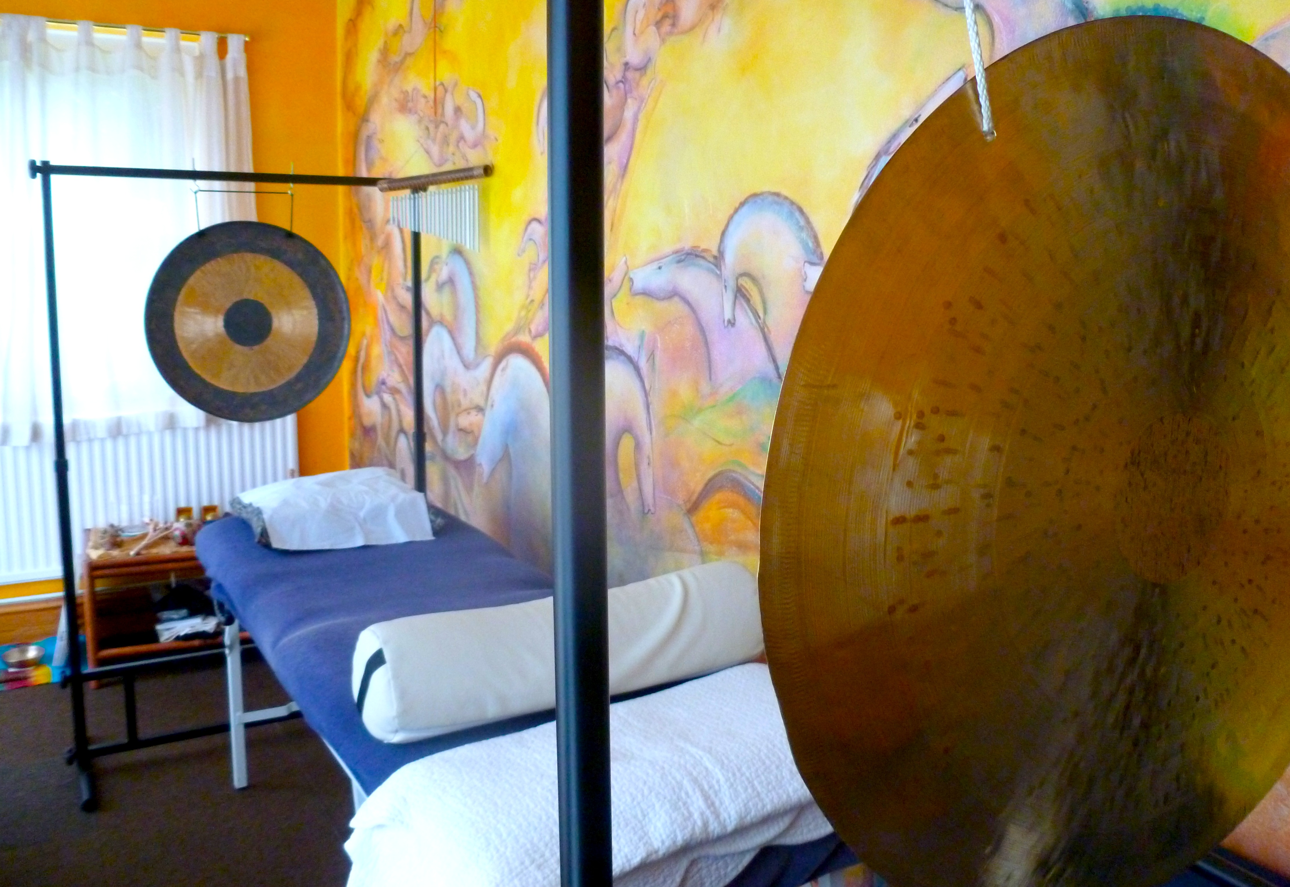 The sound scan will enable me to devise a unique soundscape, especially suited to you at that moment. As you lie on the couch, there will be a gong placed behind your head and another by your feet. These two gongs will have different tones that will complement each other as I play them alternately. When the gongs have done their work, you will be brought back to a normal operational state through the sounds of gentle percussion instruments. This will end a single, balancing, passive treatment.